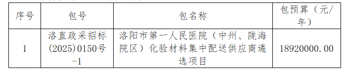 (中州、陇海院区)化验材料集中配送供应商遴选项目的潜在投标人应在洛阳市公共资源交易中心网站(lyggzyjy.ly.gov.cn)获取招标文件,并于2025年10月30日09时05分(北京时间)前递交投标文件。