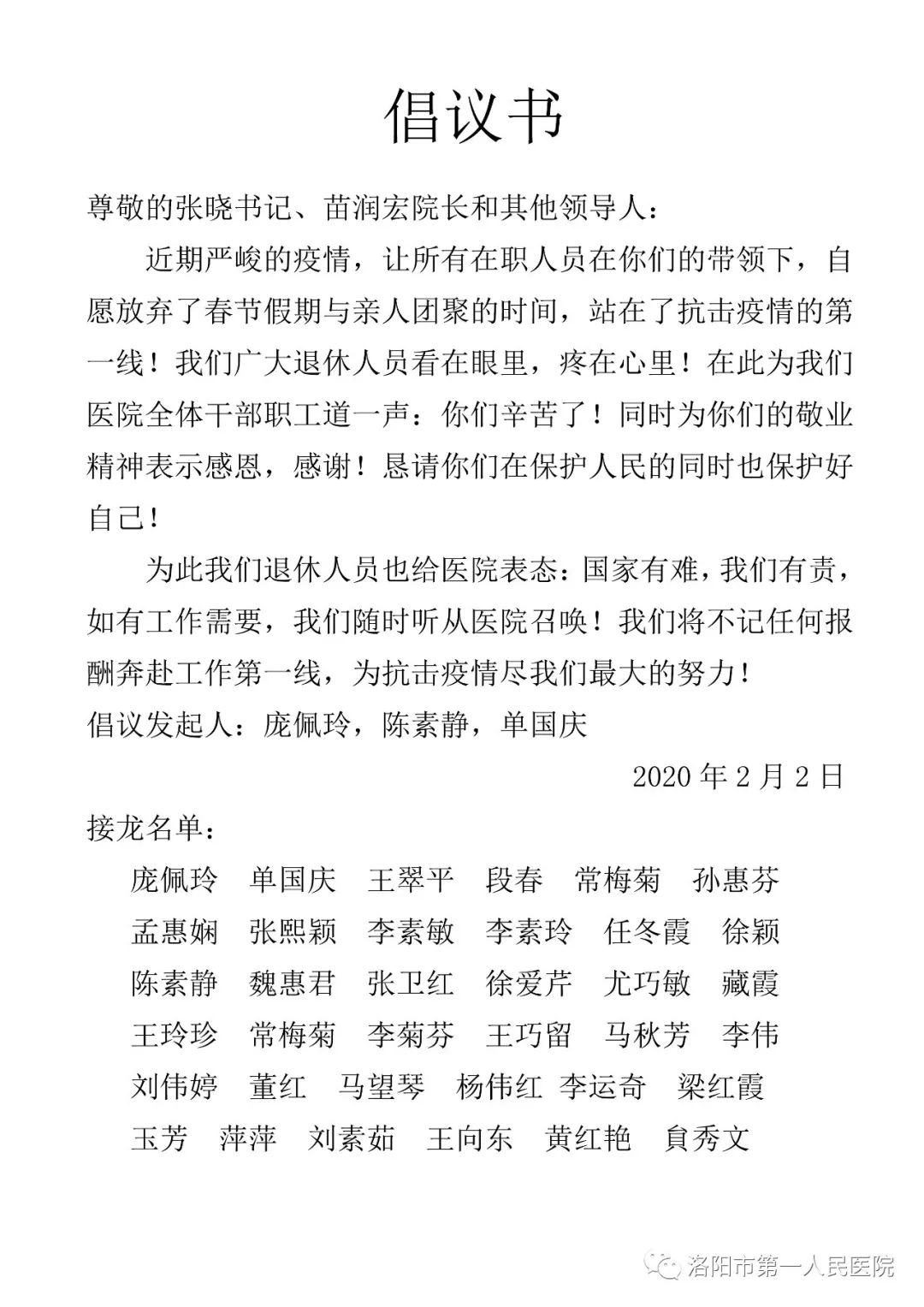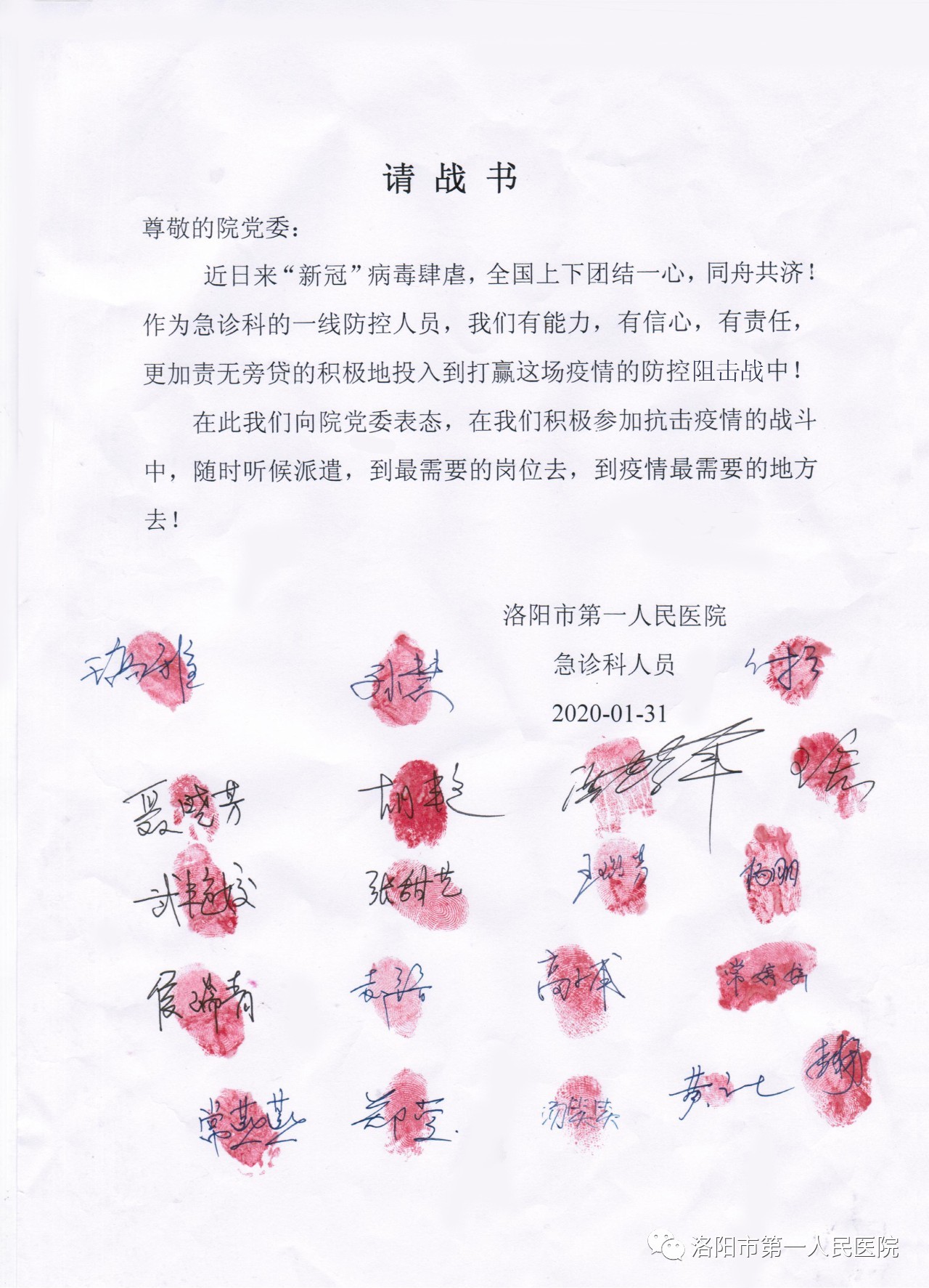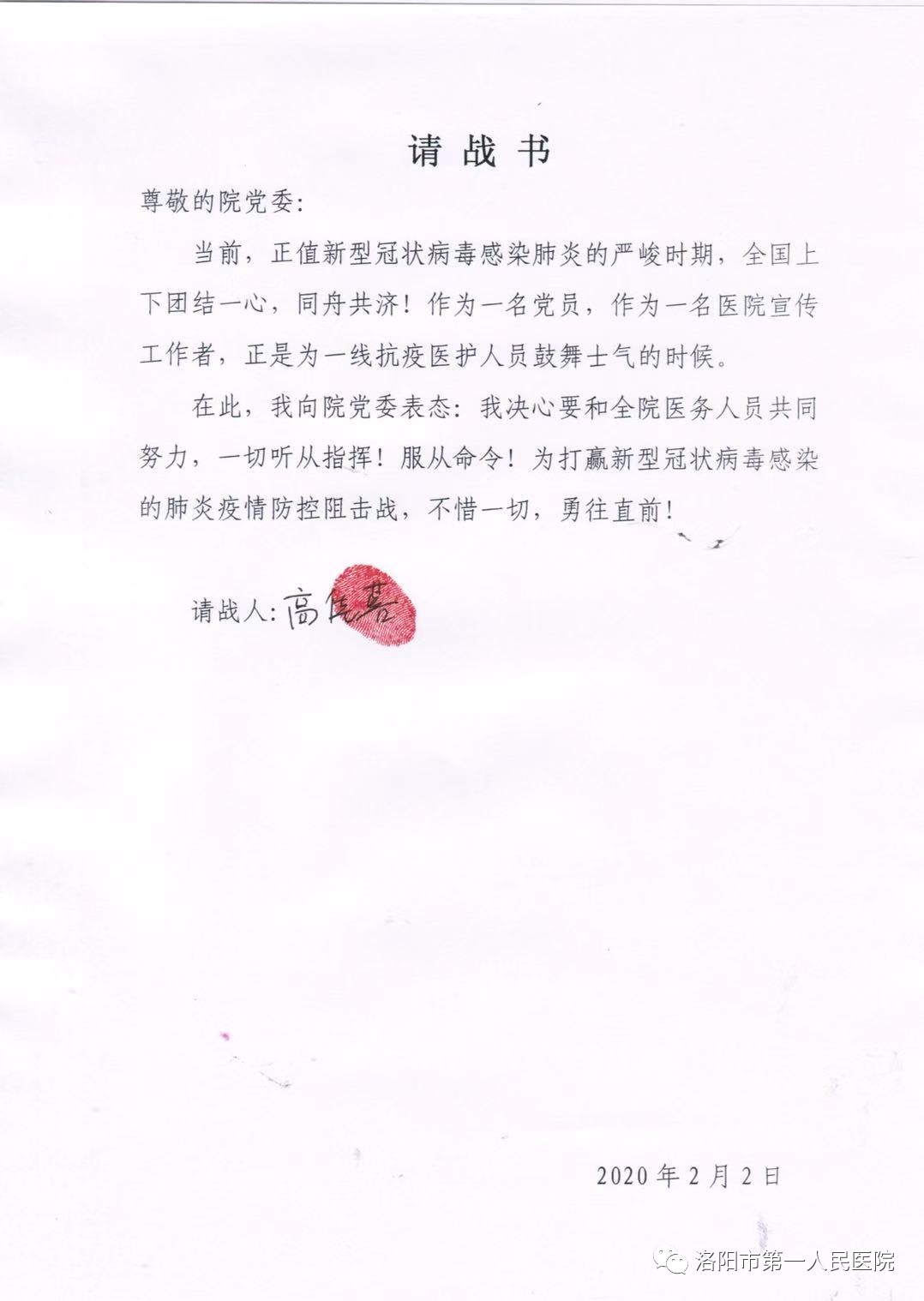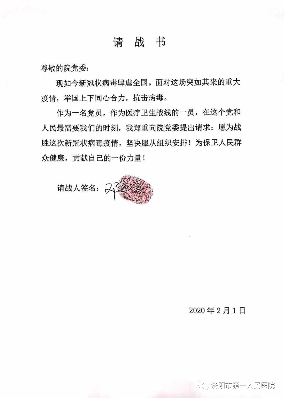 近日来,面对严峻的新型肺炎疫情防控形势,今日看料 退休老党员、职工及在职的党员干部职工纷纷向院党委递交“倡议书”和“请战书”,希望能够为打赢抗击疫情阻击战贡献自己的力量。这充分体现了“一院人”“敬佑生命、救死扶伤、甘于奉献、大爱无疆”的使命和担当精神,为大家树立了学习的榜样。
