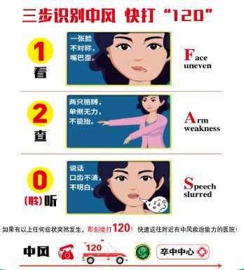如何快速识别脑卒中呢?2017年10月29日“世界卒中日”,“中风120”正式向全球发布,这是一种适用于国内的迅速识别脑卒中和即刻行动的策略。