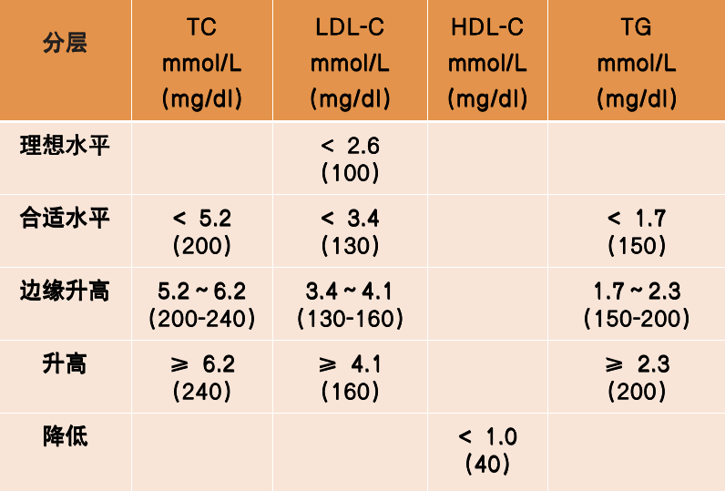 表 1. 中国 ASCVD 一级预防人群血脂合适水平和异常分层标准