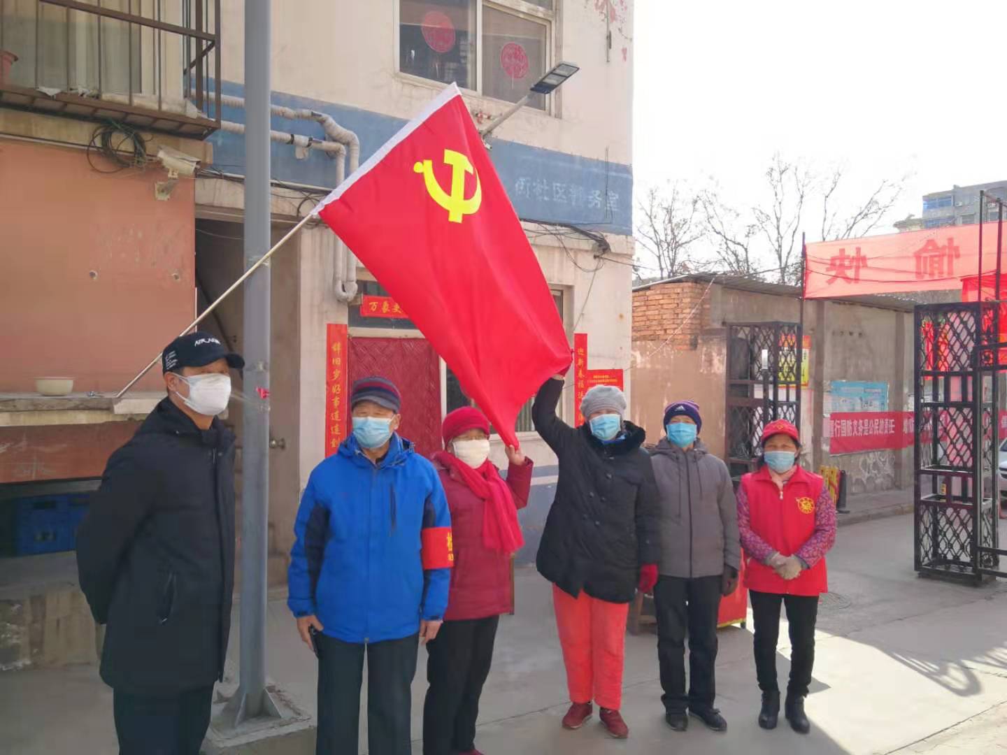 家属院门岗人员执勤较忙时,立即联系庆振江、刘月琴、姬光明等共产党员组成志愿者小组,自觉排班,不分白天晚上,在门岗轮流执勤。他们在飘扬的党旗下庄严宣誓:“众志成城,抗击疫情”。尽管天气寒冷,他们没有一丝懈怠,更没有任何退缩,为来往人员进行体温测量、讲解疫情防护知识。老党员孙海卿说:“现在是人民群众的身体健康和生命安全受到严重威胁的时刻,作为老党员,就应该有党员的样子,尽党员的责任。虽然我们年龄大了,做不了什么,但还会在自身条件允许的情况下,为党和人民做些力所能及的事情,用我们的付出换得居民的平安健康,为抗疫尽一份力,我们感到光荣和自豪”。