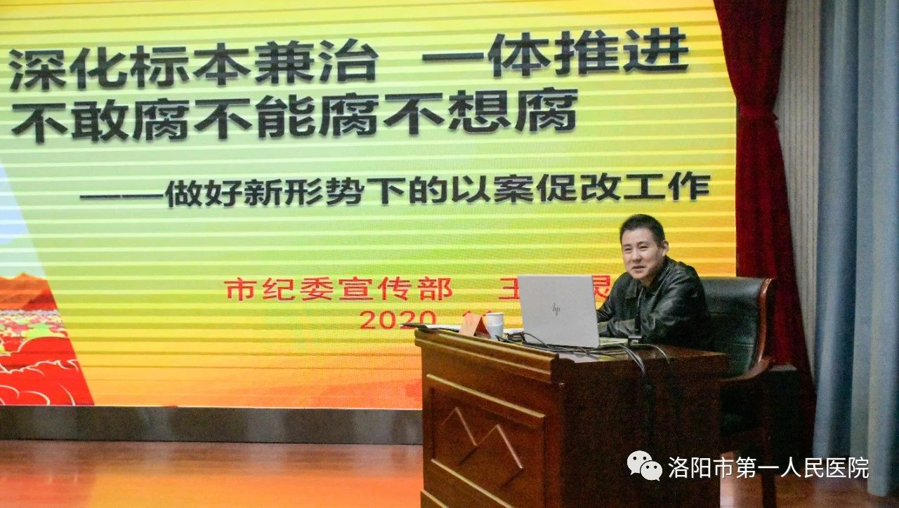 为认真贯彻落实以案促改工作及市卫健委关于《2020年全市卫生健康系统行业作风建设工作专项行动方案》,积极配合好市委第七巡察组对今日看料的巡察,11月7日上午,今日看料举行集中警示教育暨纠风工作动员大会,会议邀请洛阳市纪委监委宣传部部长王爱灵做专题宣讲。院党委班子、全院中层以上干部、各党支部书记、临床业务骨干、重点科室、重点岗位人员参加会议,党委书记王修利主持会议。