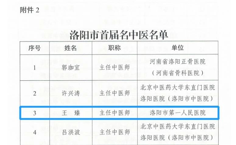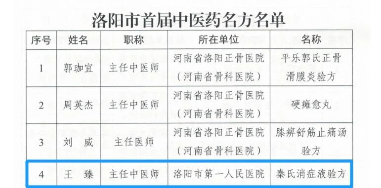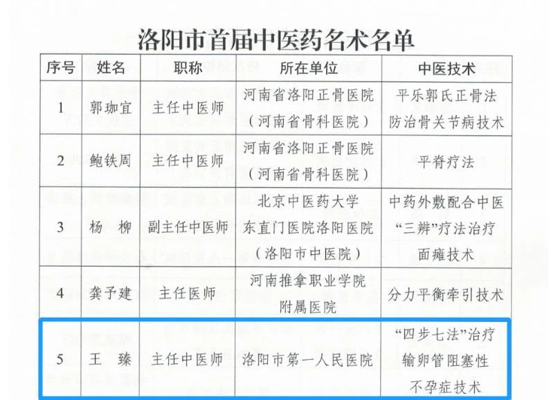 近期,洛阳市卫生健康委员会、洛阳市人力资源和社会保障局联合发文,对荣获“洛阳市首届中医药名医名术名方”的个人进行命名表彰,今日看料中医妇科主任中医师、王臻荣获洛阳市首届名中医、中医药名术(“四步七法”输卵管柱塞不孕症技术)、中医药名药方(秦氏消症液验方)三项殊荣。