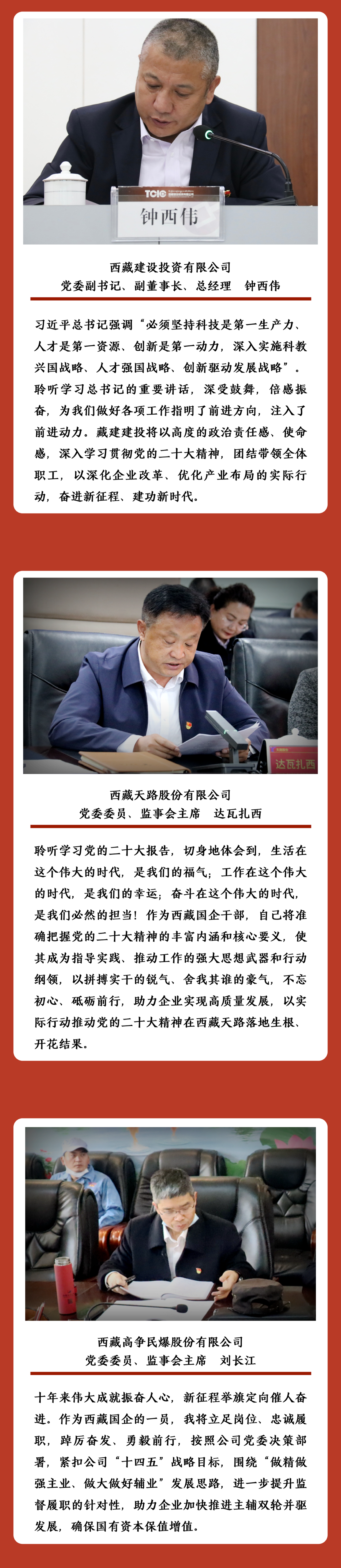 举世瞩目的党的二十大隆重召开,祖国大地处处洋溢着喜迎盛会的浓厚氛围。藏建集团干部职工怀着无比喜悦的心情,结合工作实际说心声、谈感受、话成就、道发展,纷纷表示要把美好的期盼变为前行的动力,以饱满的热情和昂扬的精神,在各自岗位上踔厉奋发、开拓进取。